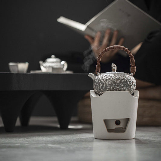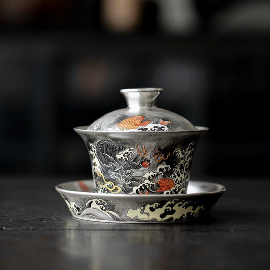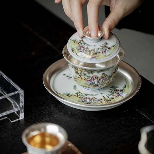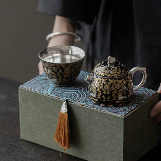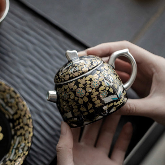 999 Sterling Silver Gold Branches and Jade Leaf Ceramic Tea Pot