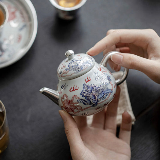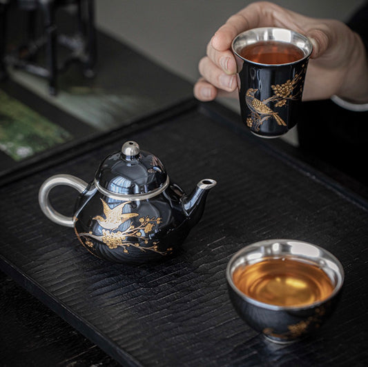 999 Sterling Silver Gold Branches and Jade Leaf Ceramic Tea Pot