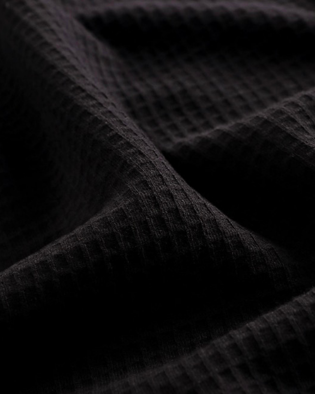Waffle-Knit Fabric – Enhances warmth and airflow while maintaining a lightweight, structured drape.