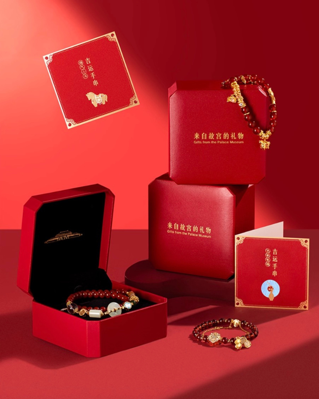 Prosperity red paired with warm imperial gold, accented by soft jade and crystal tones.