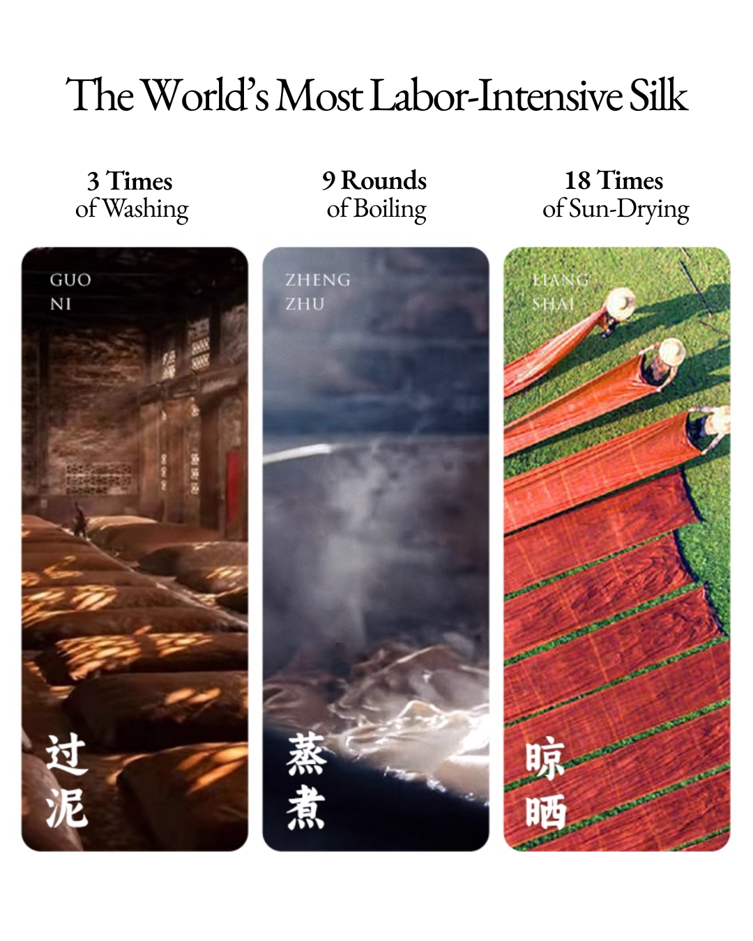 This traditional “Three Steams, Nine Boils” process gives Cloud Silk its unmistakable softness, durability, and refined sheen.