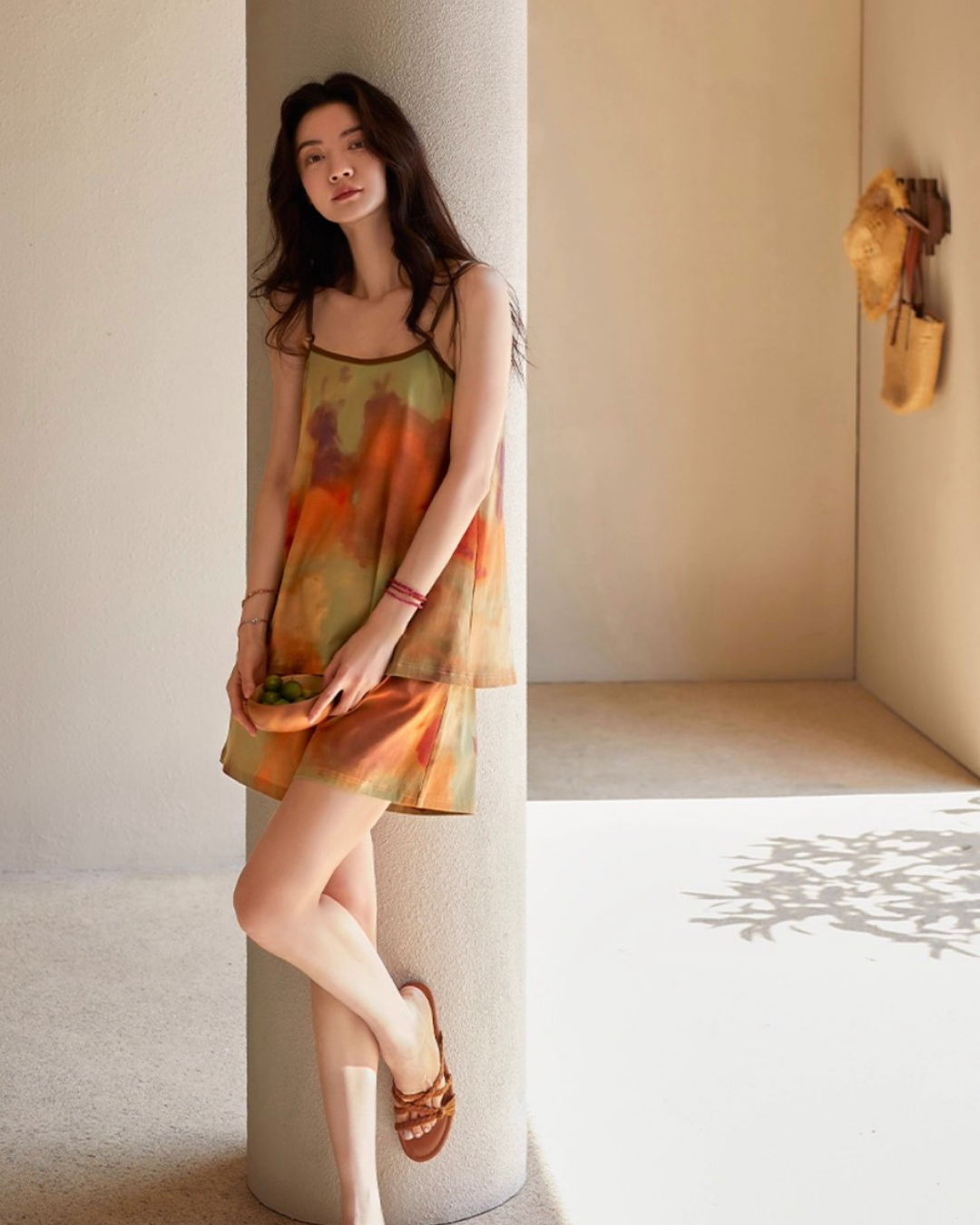 Immerse yourself in the warmth of late summer light with the Hán Pajamas Set, where soft tones and painterly hues blend like sunlight on silk. Its abstract watercolour pattern evokes the quiet rhythm of nature — serene, fluid, and effortlessly graceful.