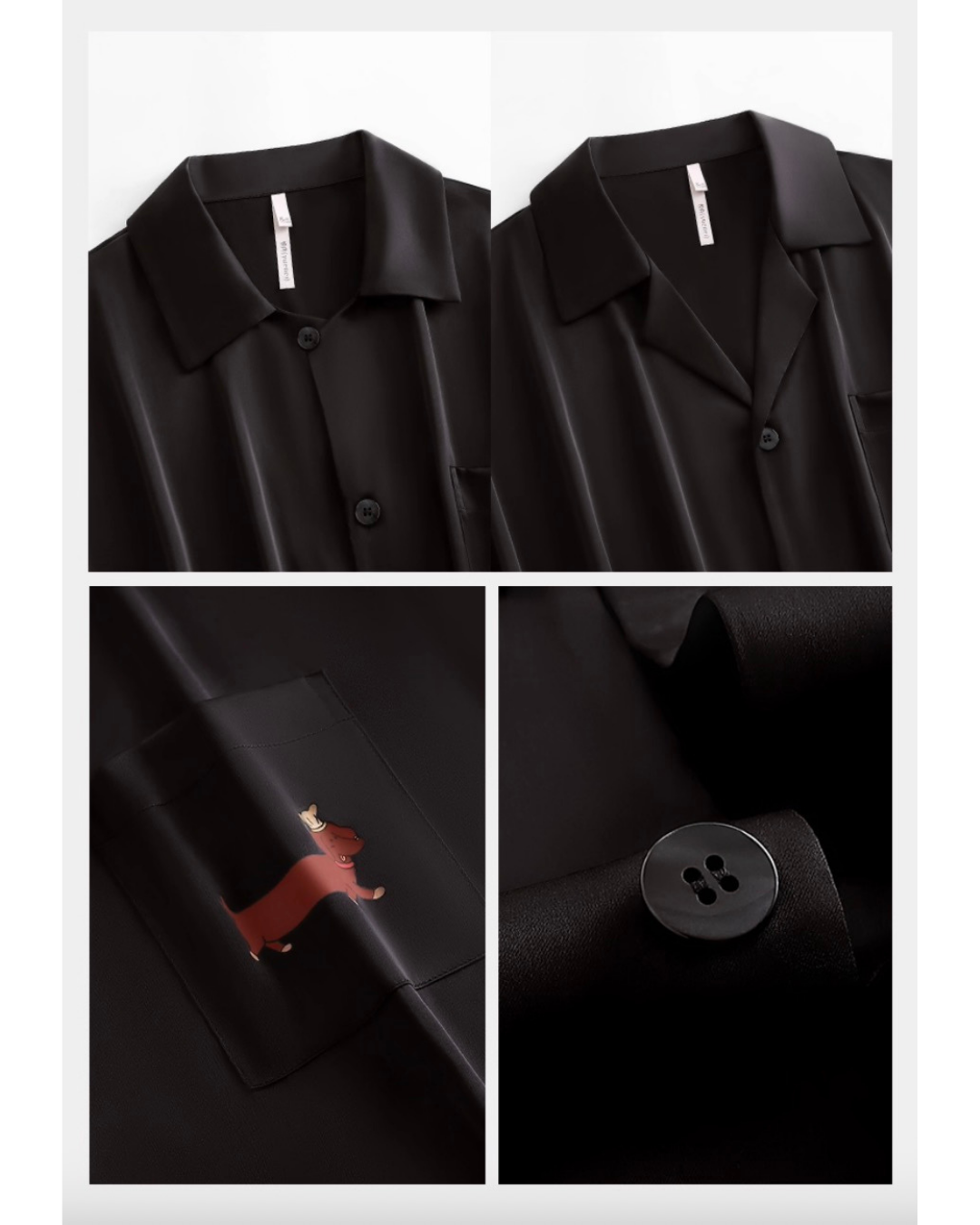 The Míng Pajamas Set captures the charm of quiet nights and playful companionship — where comfort meets character. With its lustrous black sheen and whimsical dachshund embroidery, this set blends sophistication with a touch of warmth and humour. Designed for couples or individuals who cherish both elegance and ease, Míng turns lounging into a moment of joy and relaxation.