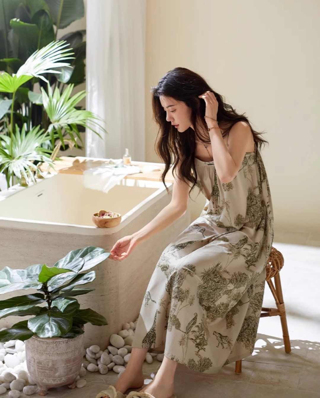 Ease into a state of effortless calm with our Sēn Dress, where the tranquility of nature meets modern elegance. Inspired by quiet mornings and sunlit gardens, this flowing silhouette is crafted from a premium cotton–modal blend, offering an exceptionally soft, breathable feel against the skin. The subtle botanical motif captures the grace of trees and wilderness, bringing a touch of serenity to your home rituals.