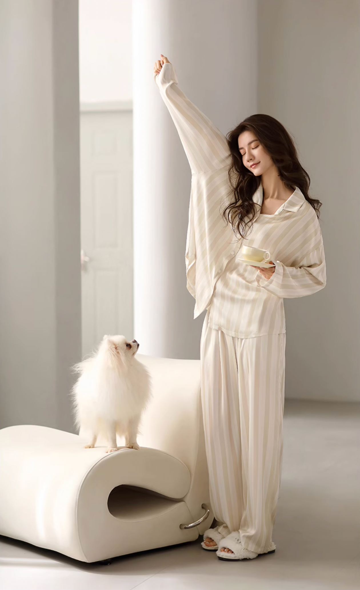 Indulge in the gentle comfort of Nái 奶, a loungewear set designed for those who appreciate softness, warmth, and understated elegance. Crafted from a modal-cotton blend, this set offers a luxurious silky touch while maintaining breathability for all-day ease. The creamy beige tones and subtle striped pattern evoke a sense of tranquility, making it perfect for lounging at home or casual wear.