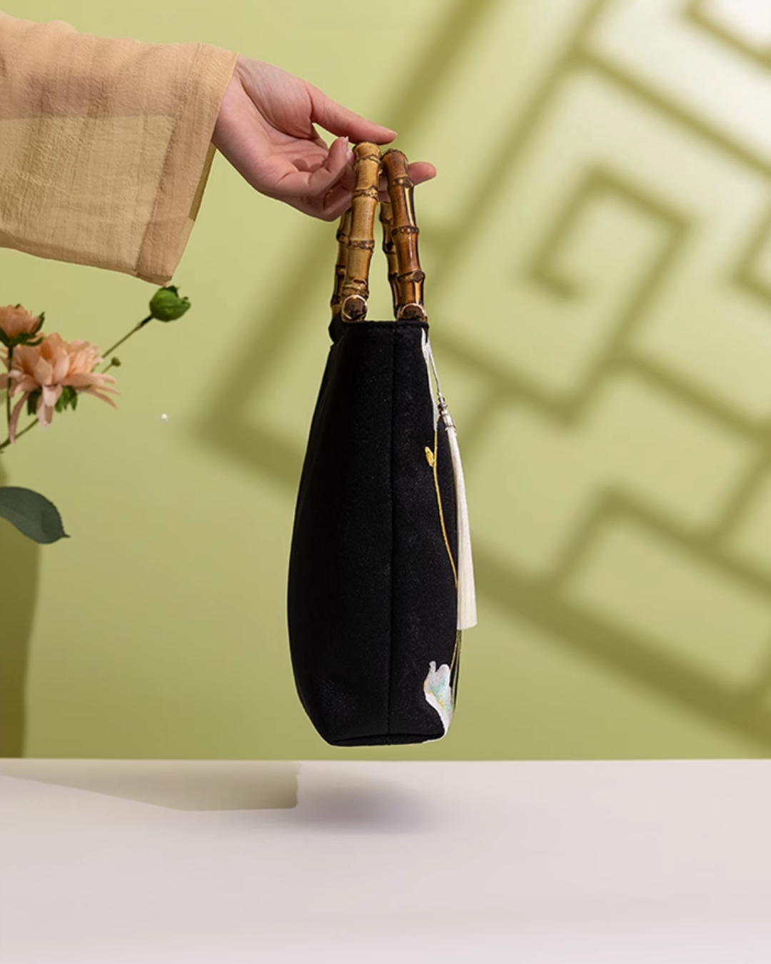 Hardware: Polished bamboo-style resin top handle complemented by a traditional ivory silk tassel and gold-toned zip hardware—combining natural warmth with elegant function.