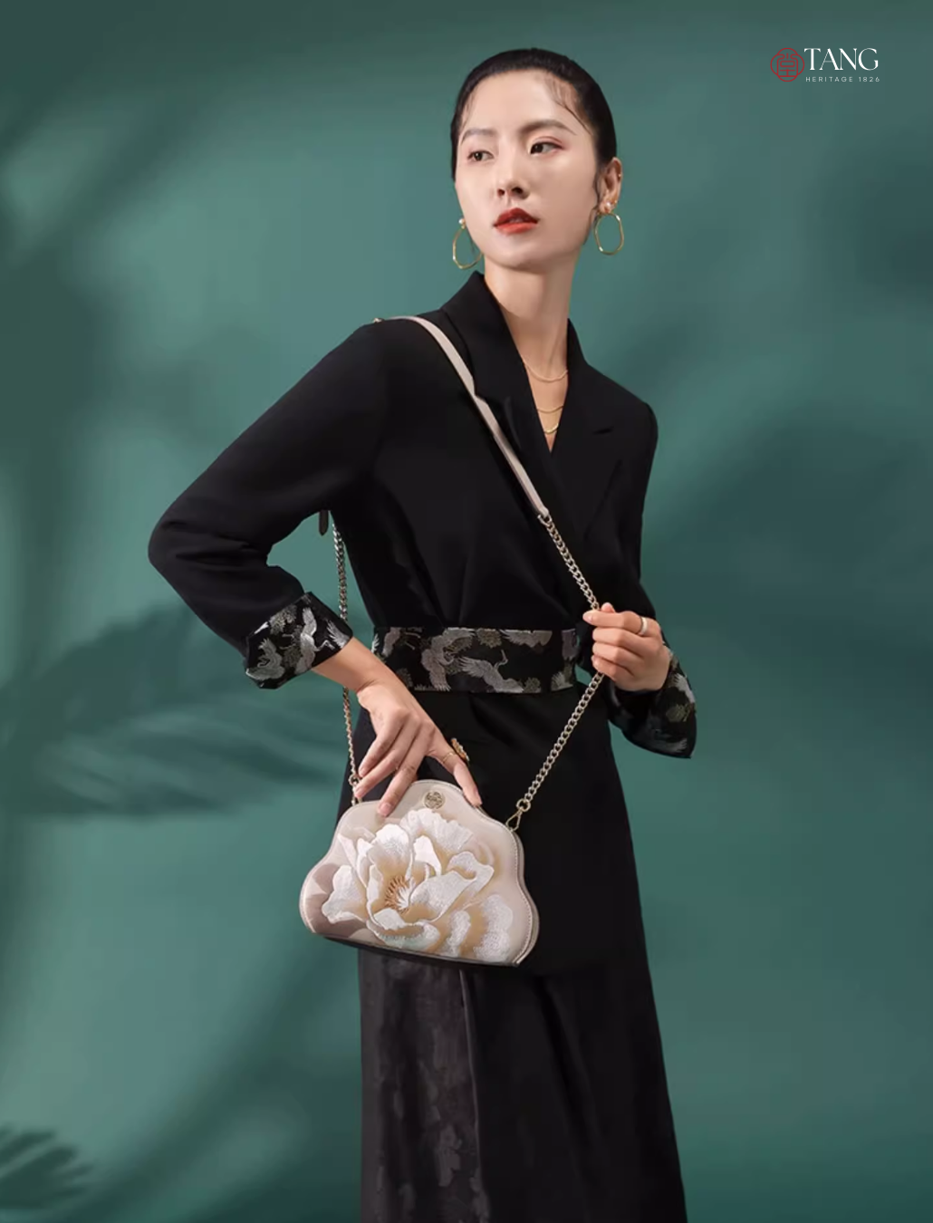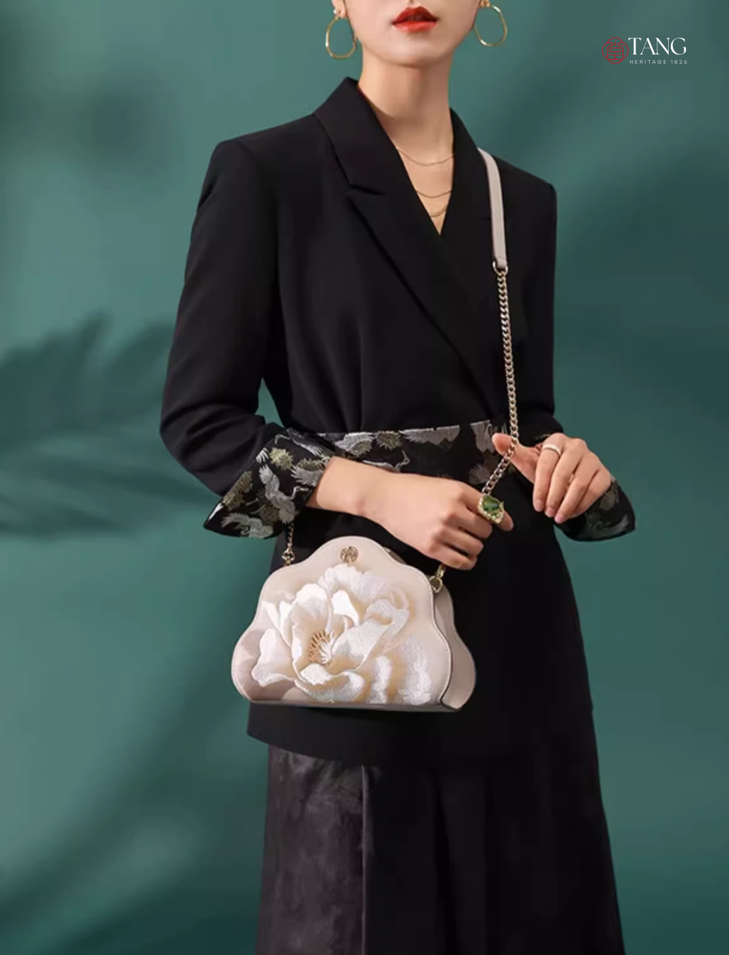 The Tang Imperial 25 Embroidered Peony Bloom Shoulder Bag embodies the spirit of Tang Heritage—timeless, elegant, and crafted for those who value artistry in every detail.