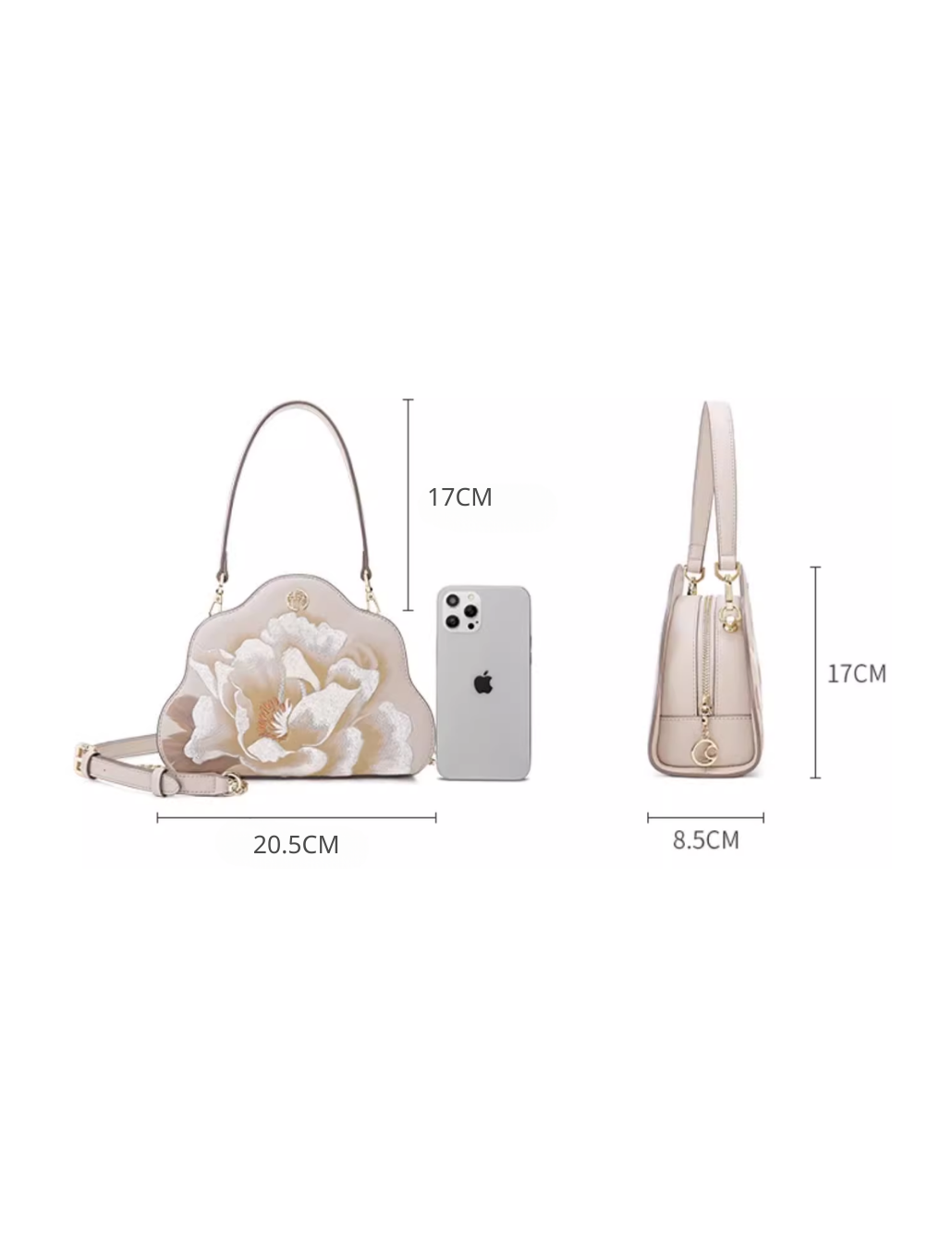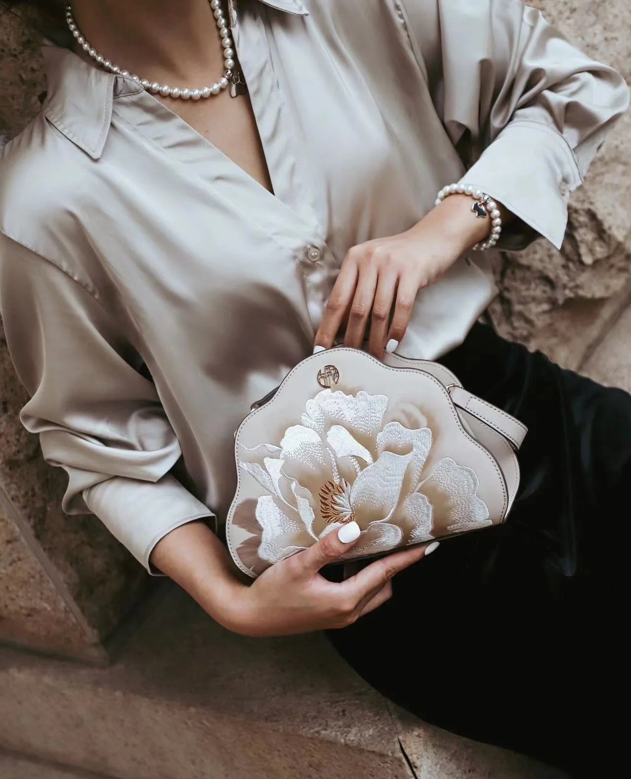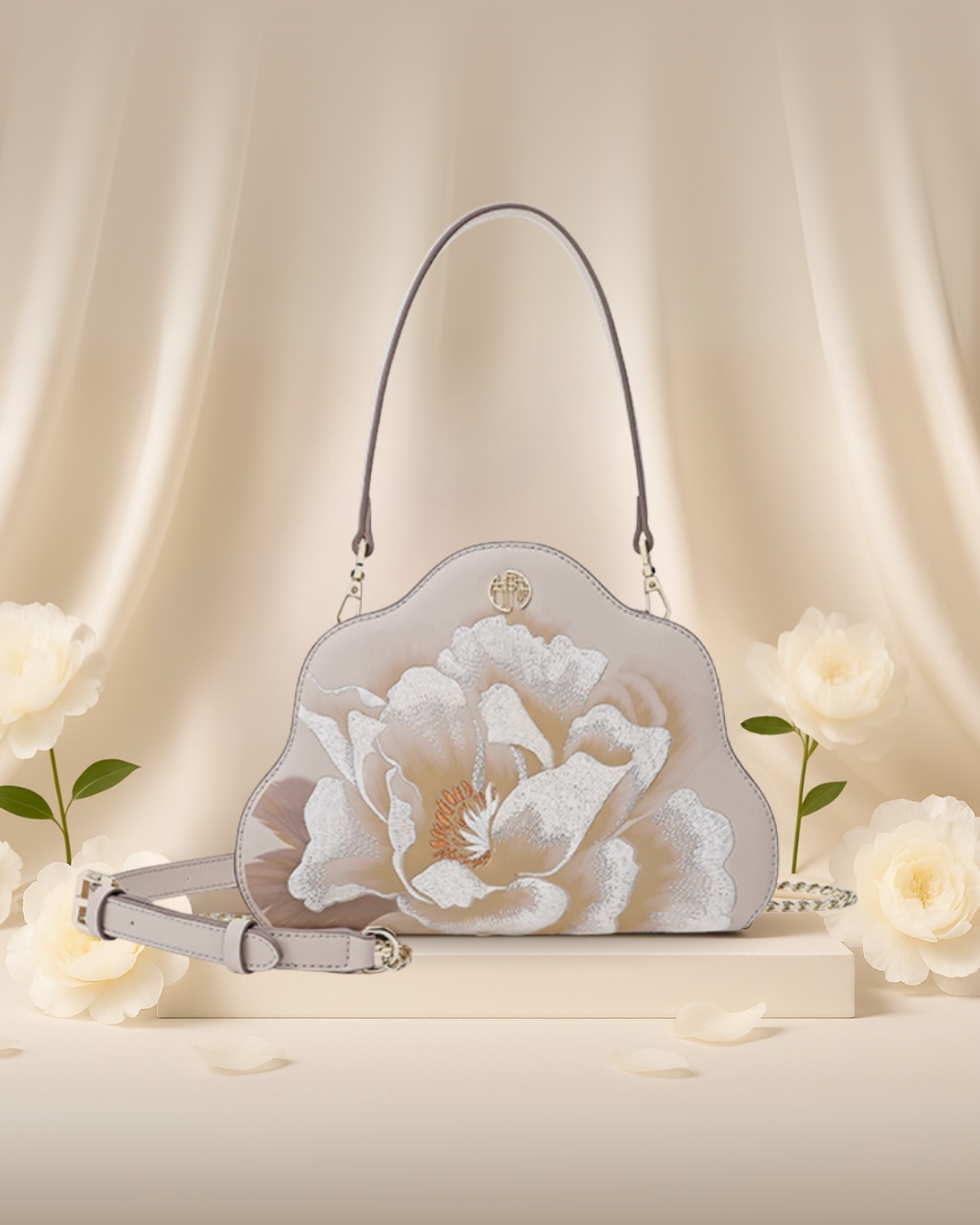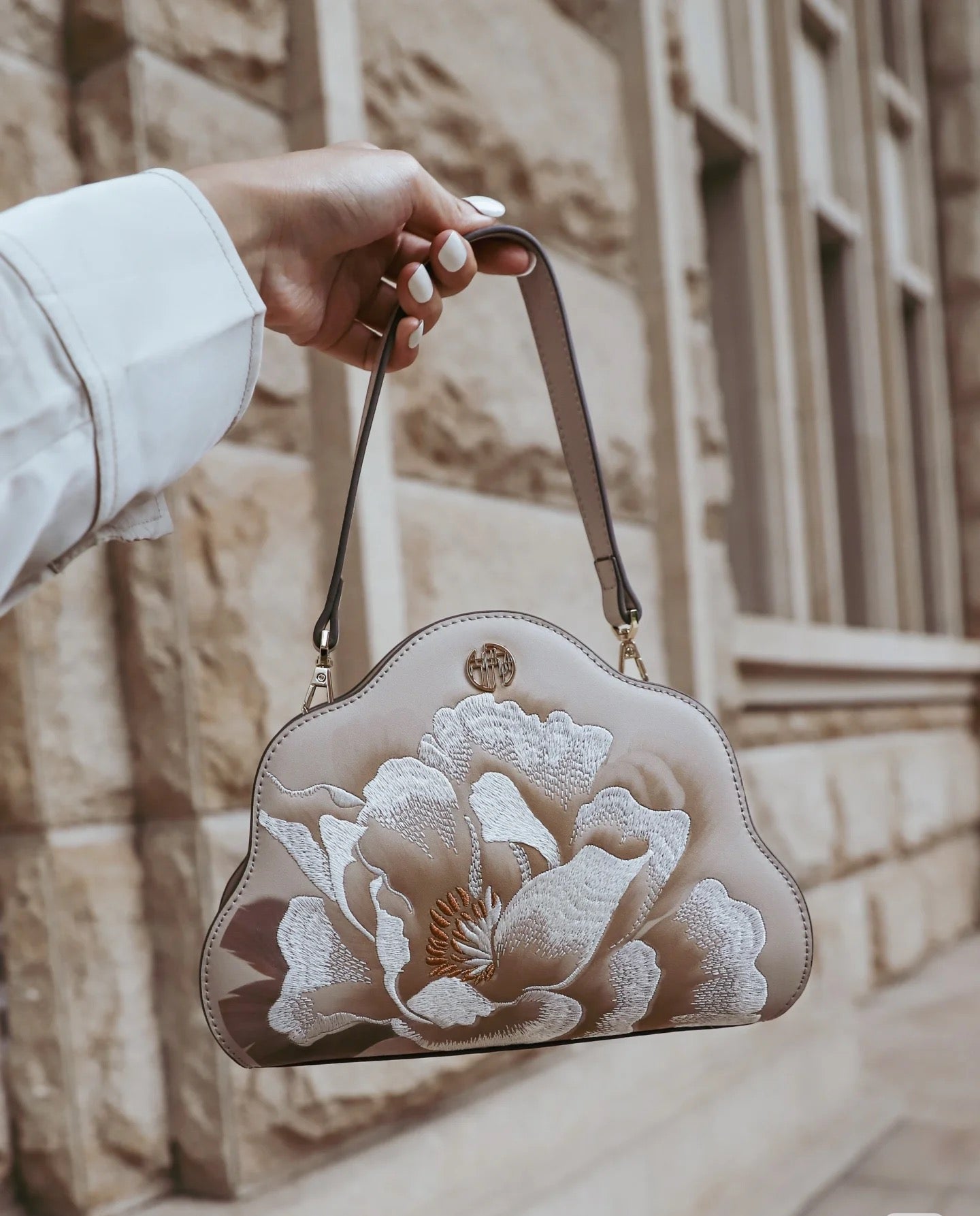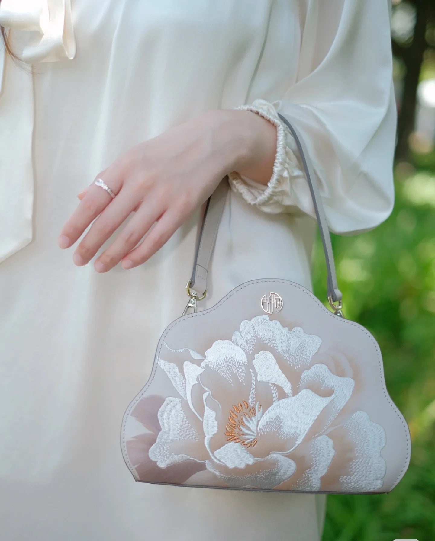The Tang Imperial Embroidered Peony Bloom series pays homage to the most beloved flower of China: the peony, hailed as the “true national beauty.” Embroidered in sumptuous layers of silk thread, each bag blooms with exquisite detail, symbolizing wealth, honor, and grace. The flowing contours and soft sheen of the leather canvas elevate these designs into elegant portraits of prosperity and poetic charm. With every petal echoing dynastic romance and modern refinement, this collection is for those who seek to embody quiet grandeur and dignified femininity.