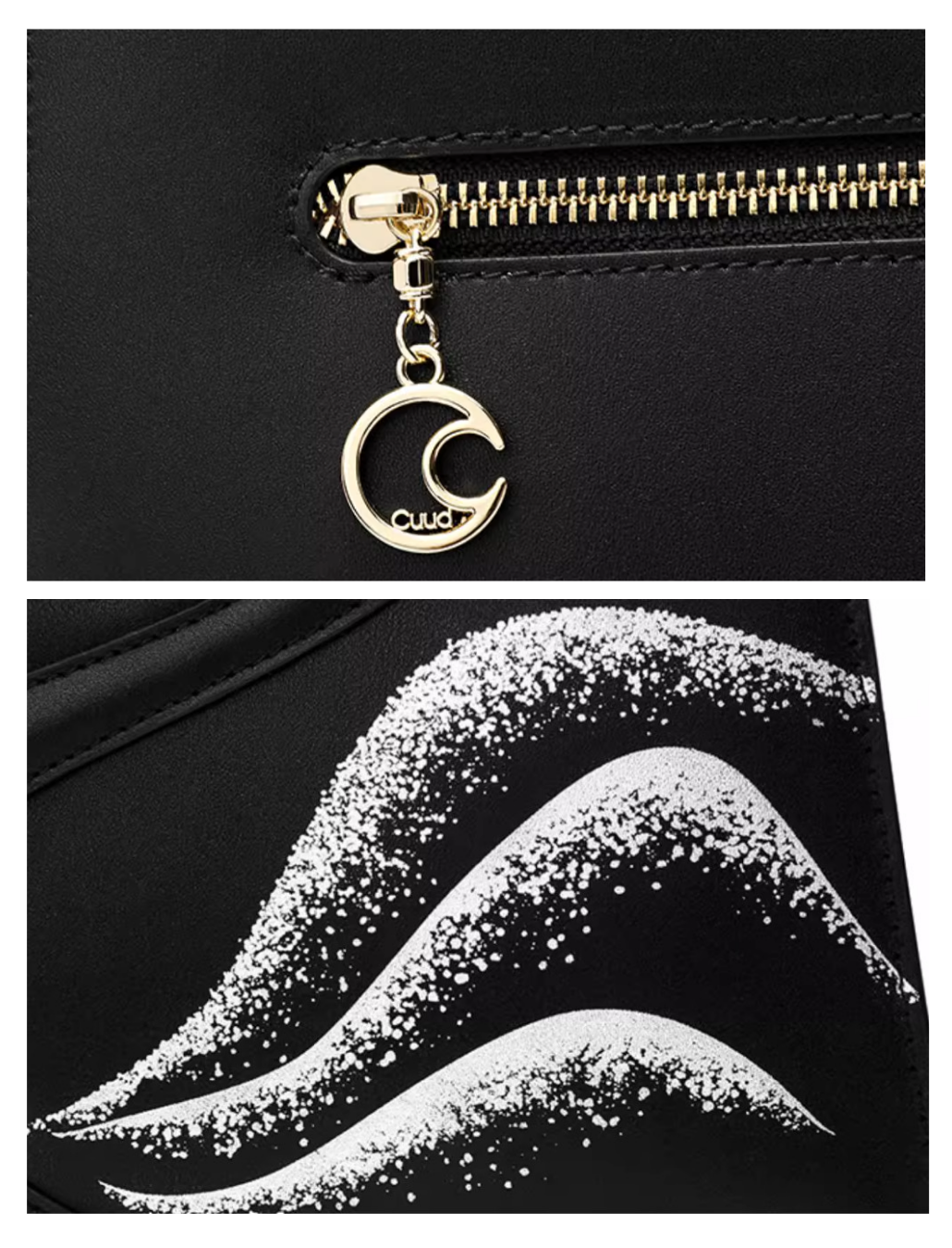 - Gold-toned hardware with crescent charm zipper pull, enhancing its refined character