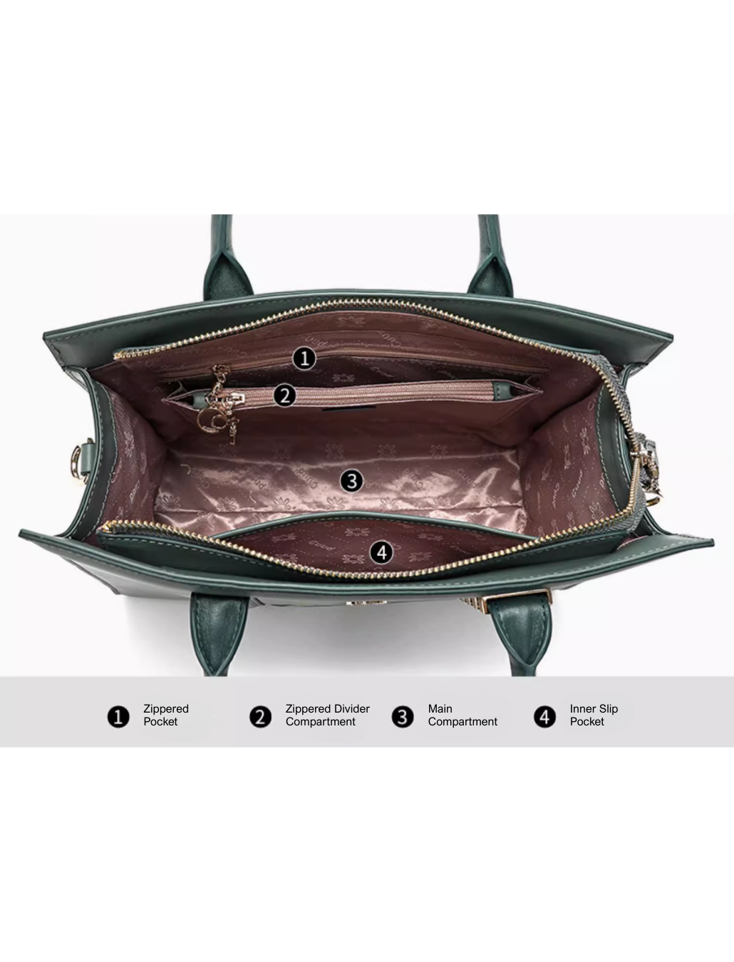 - Spacious interior with organized compartments: zippered sections, slip pockets, and a generous main compartment for daily essentials