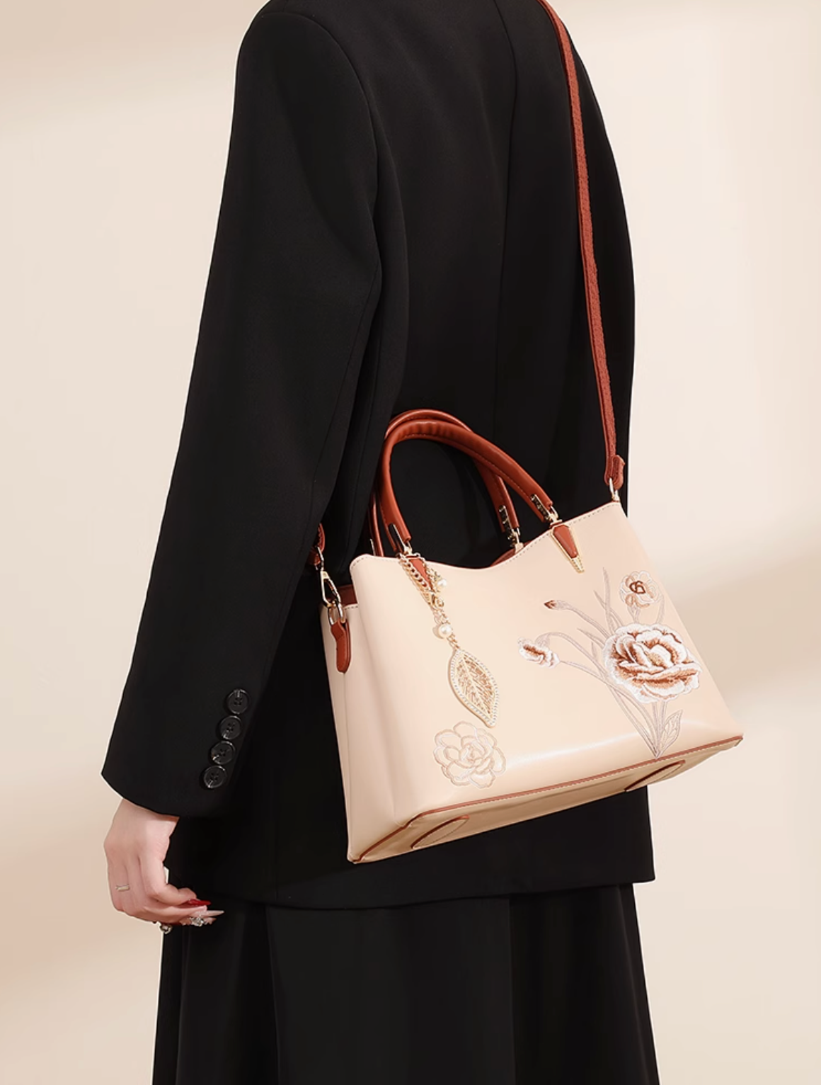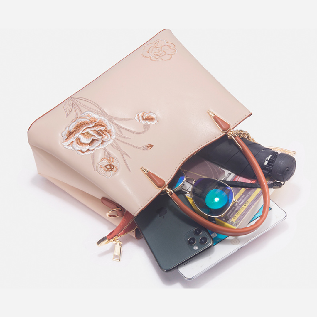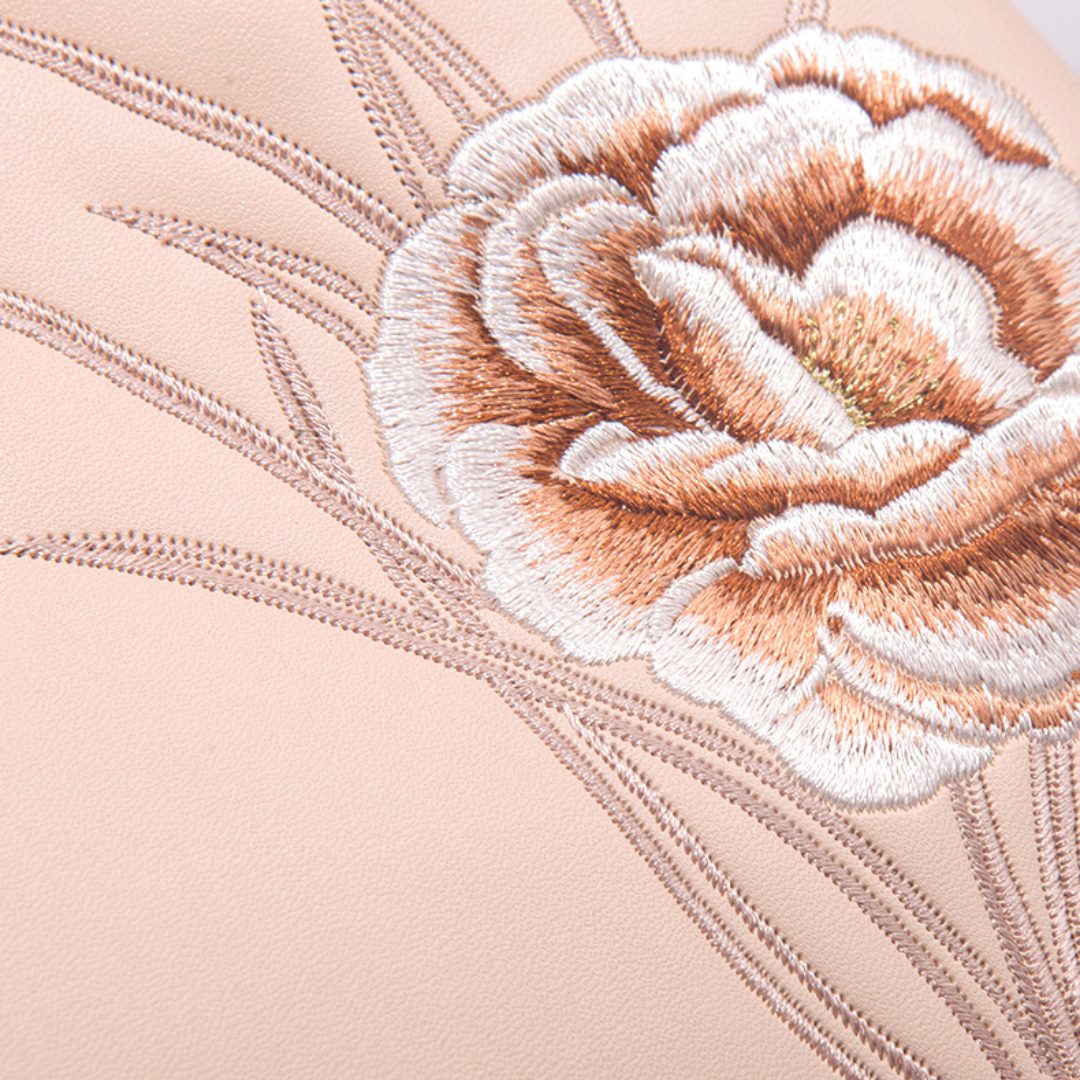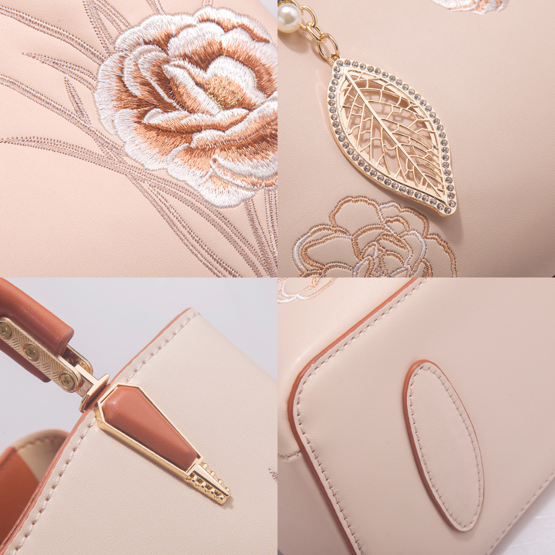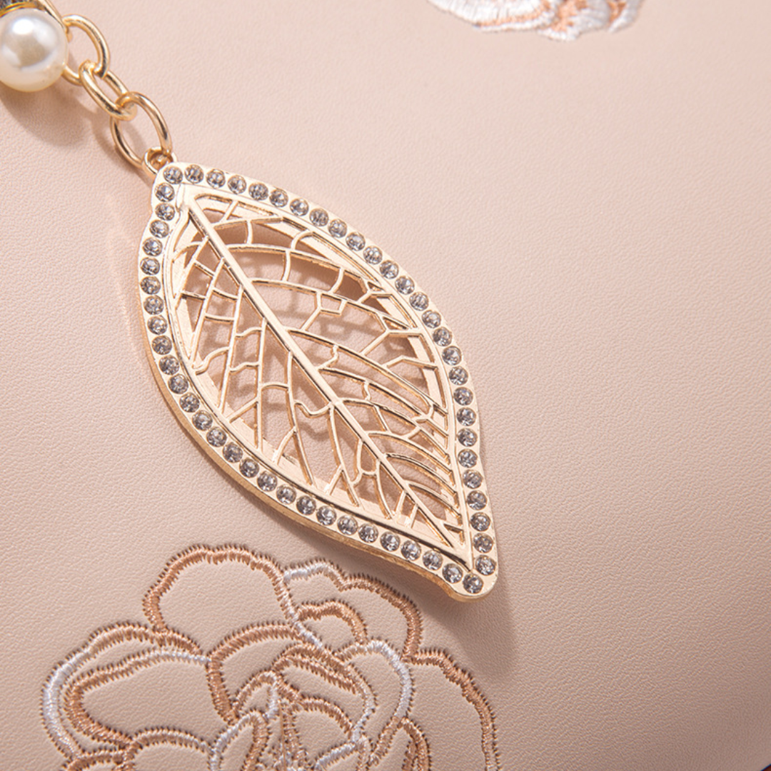 Adorned with hand-stitched embroidery, crafted from supple premium leather, and accented with polished gold-tone hardware, it is the epitome of elegance and refinement.